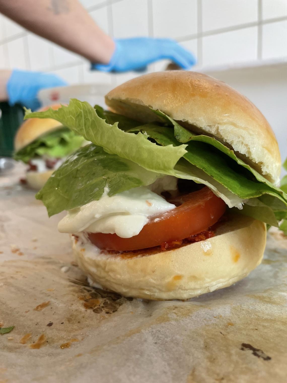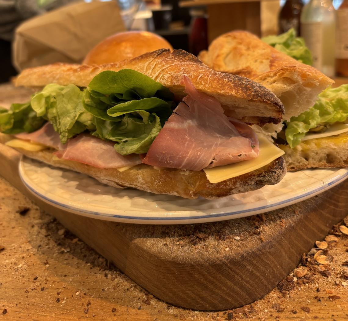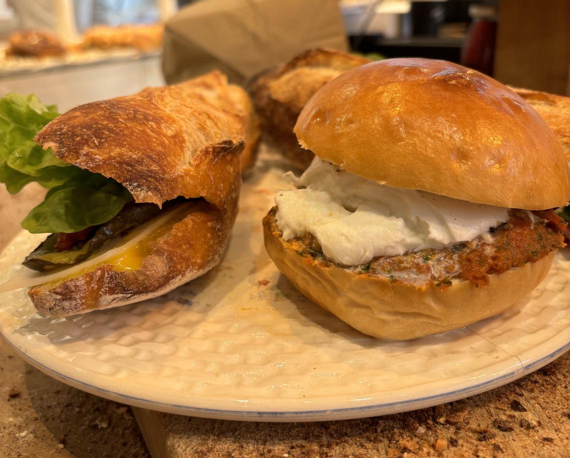 Tous les midis, Janine propose des sandwichs et des buns salés à base de produits locaux et de saison, avec toujours une option végétarienne à la carte.