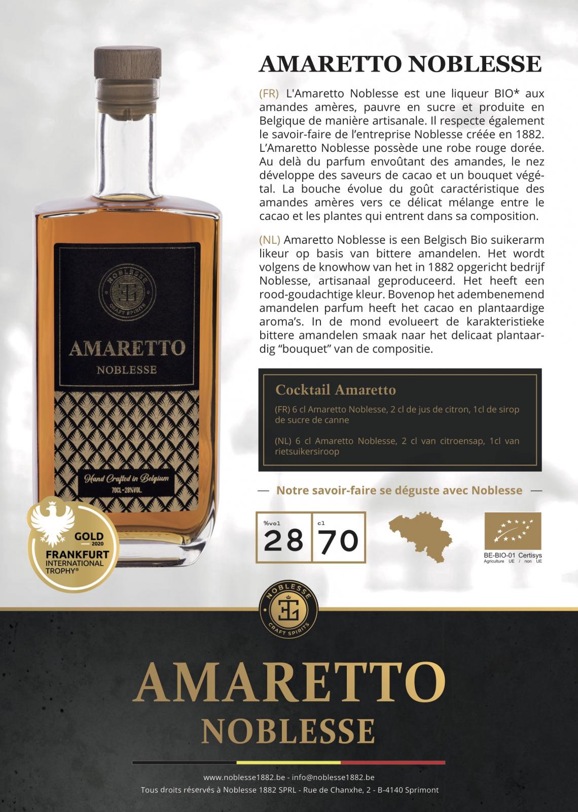 L'Amaretto Noblesse est une liqueur aux amandes amères et pauvre en sucre. Il possède une robe rouge dorée. Au delà de l’odeur envoûtante des amandes, le nez développe des saveurs de cacao et un léger bouquet végétal. La bouche évolue du goût caractéristique des amandes amères vers ce délicat mélange entre le cacao et les plantes qui entrent dans sa composition.