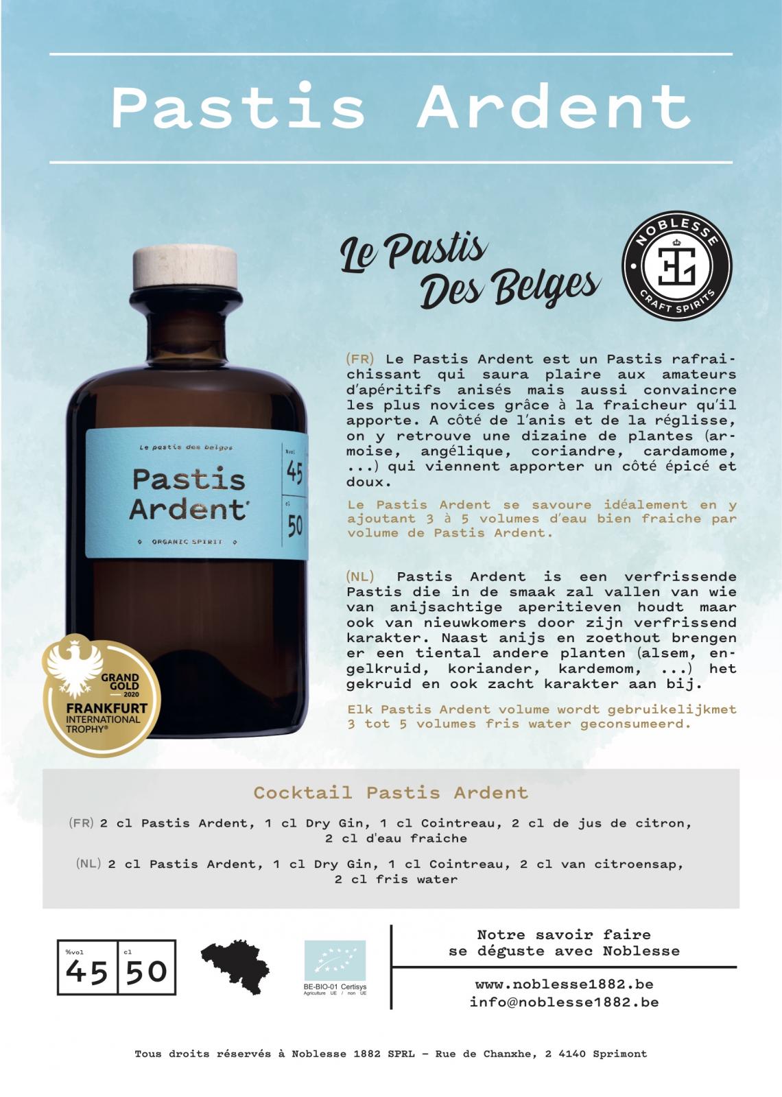 Le Pastis Ardent est un Pastis rafraîchissant qui saura plaire aux amateurs d’apéritifs anisés, mais aussi convaincre les plus novices grâce à la fraîcheur qu’il apporte. A côté de l’anis et de la réglisse, on y retrouve une dizaine de plantes (armoise, angélique, coriandre, cardamome...) qui viennent apporter un côté à la fois épicé et doux.