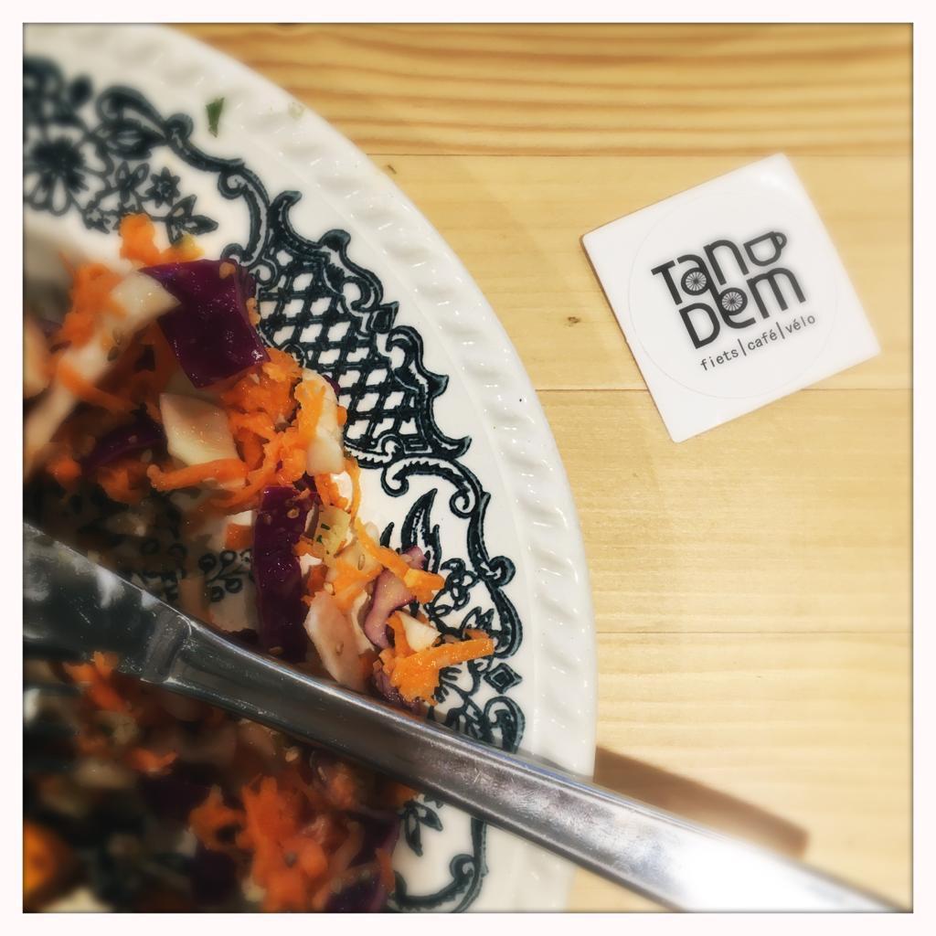 Dans la partie restaurant-café de son café vélo, Tandem a fait le choix de travailler avec des produits de saison et locaux. L’équipe de cuisine travaille uniquement avec des aliments frais et tout est transformé par leurs soins sur place. Le restaurant propose une carte variée avec des options végétariennes et adaptées à toutes les tailles d'appétit.
