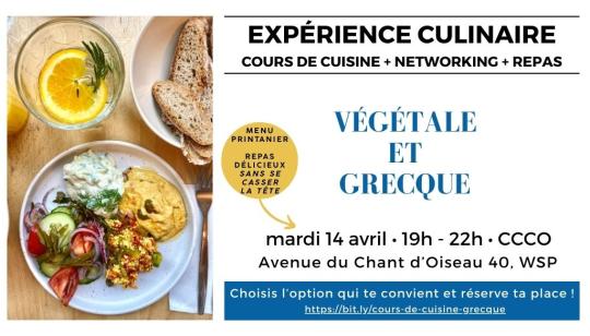 La cuisine grecque - ou la meilleure cuisine du monde - en version 100% végétale et gourmande t'attend le mardi 14 avril pour une expérience culinaire inoubliable (cours de cuisine + networking + repas) !