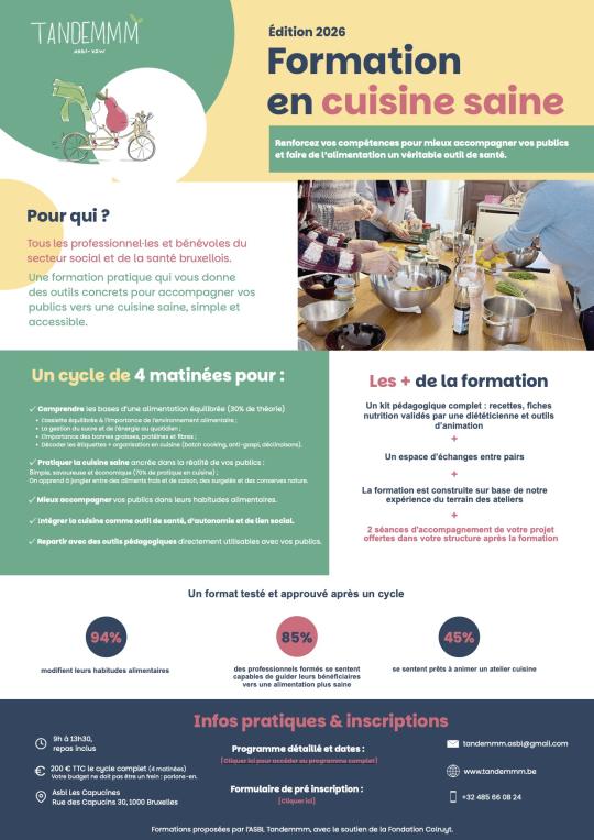 Ces formations en cuisine saine s’adressent aux professionnel·les et bénévoles du secteur social et de la santé bruxellois : travailleurs sociaux, éducateurs, acteurs de l’aide alimentaire, projets communautaires et initiatives locales de santé, souhaitant renforcer leurs compétences autour de la cuisine santé pour accompagner leurs publics.