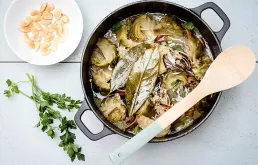 Cocotte d’artichauts à la menthe, aux amandes et au vin blanc Entrée Difficulté : 1 sur 3 Temps total : 1 h 25 '