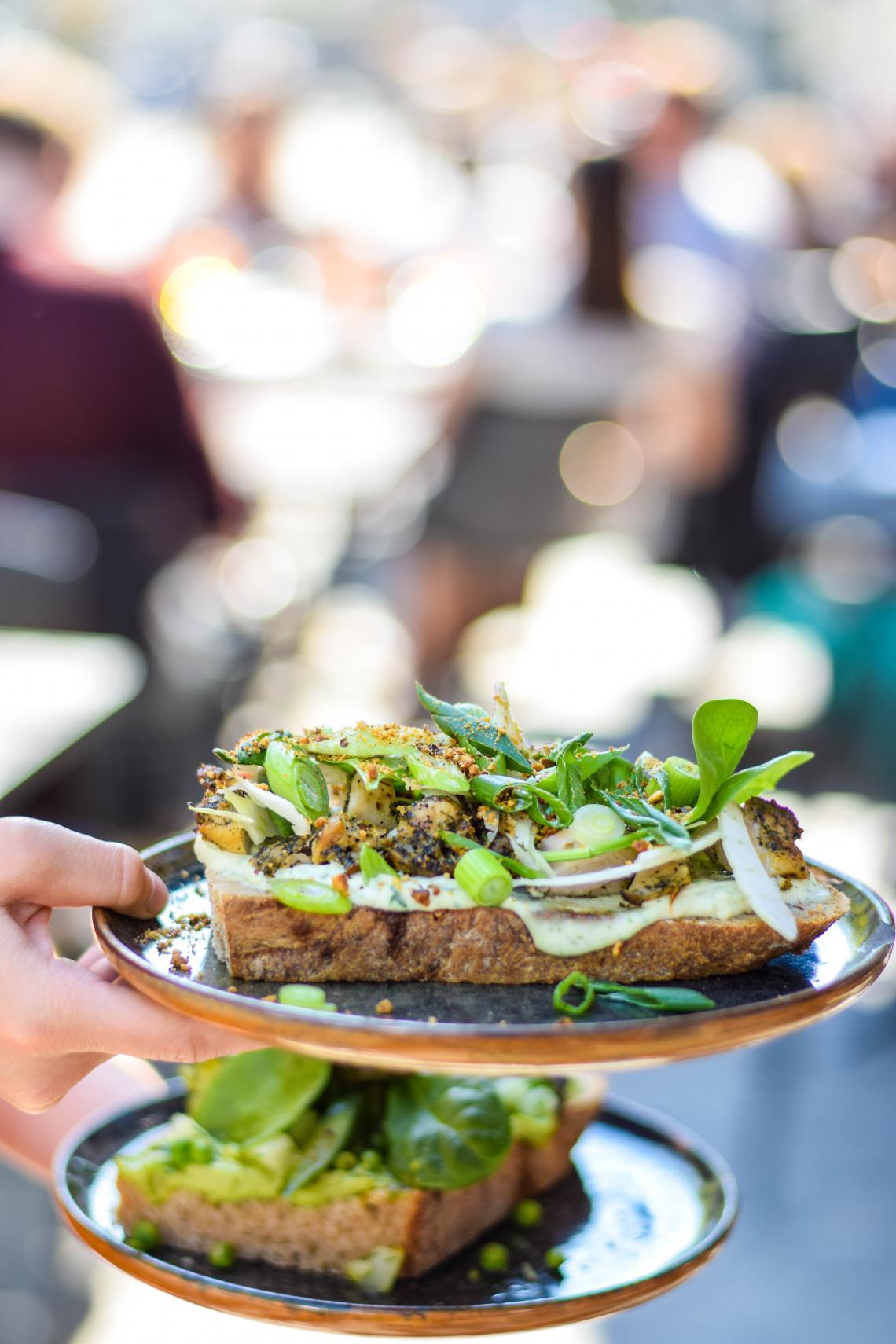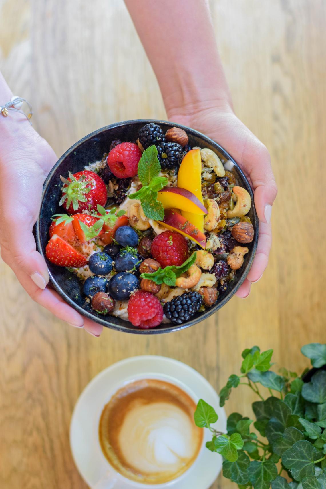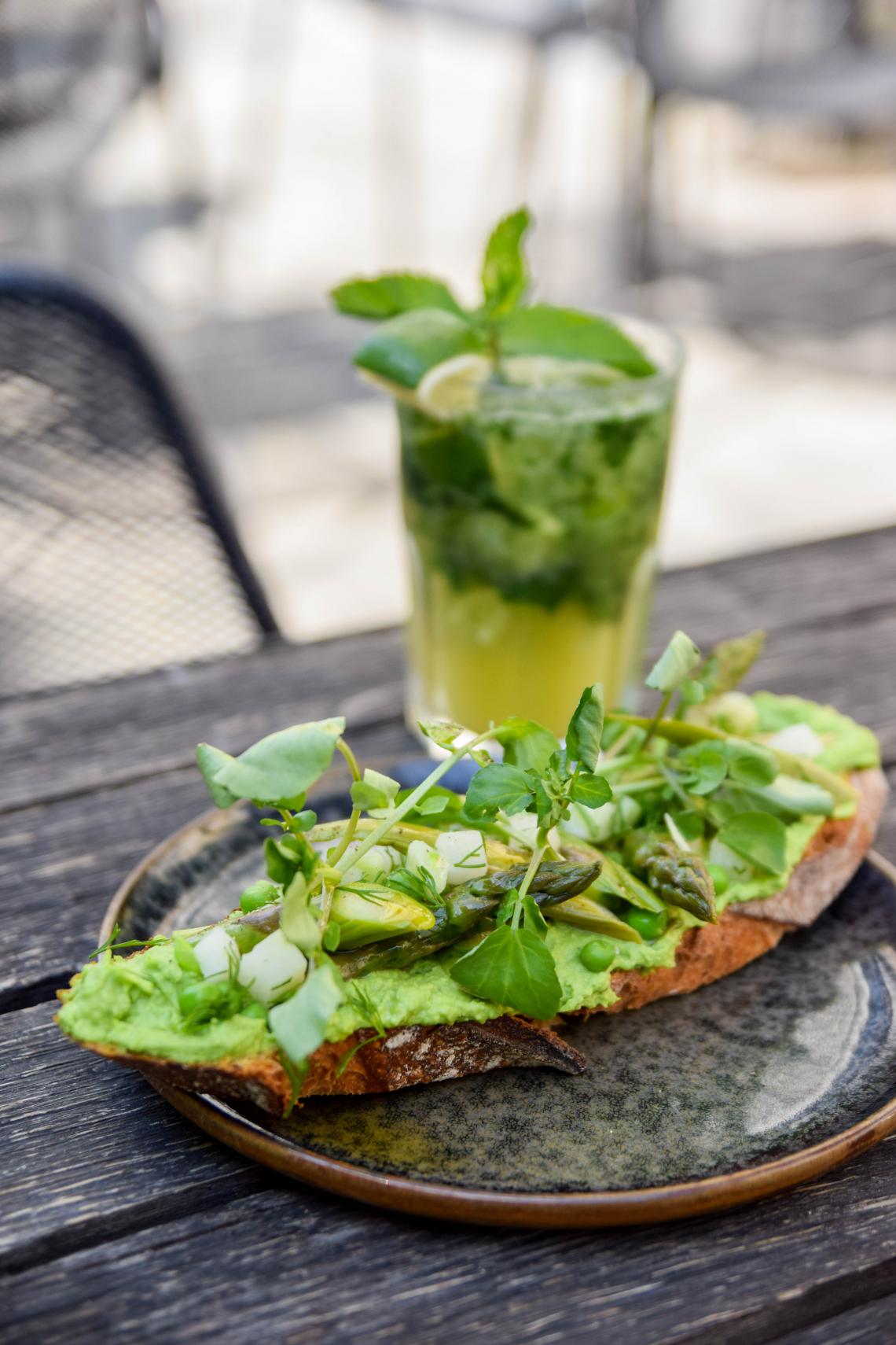 Het café serveert duurzame, gezonde en flexitarische voeding die in de halfopen keuken wordt klaargemaakt.