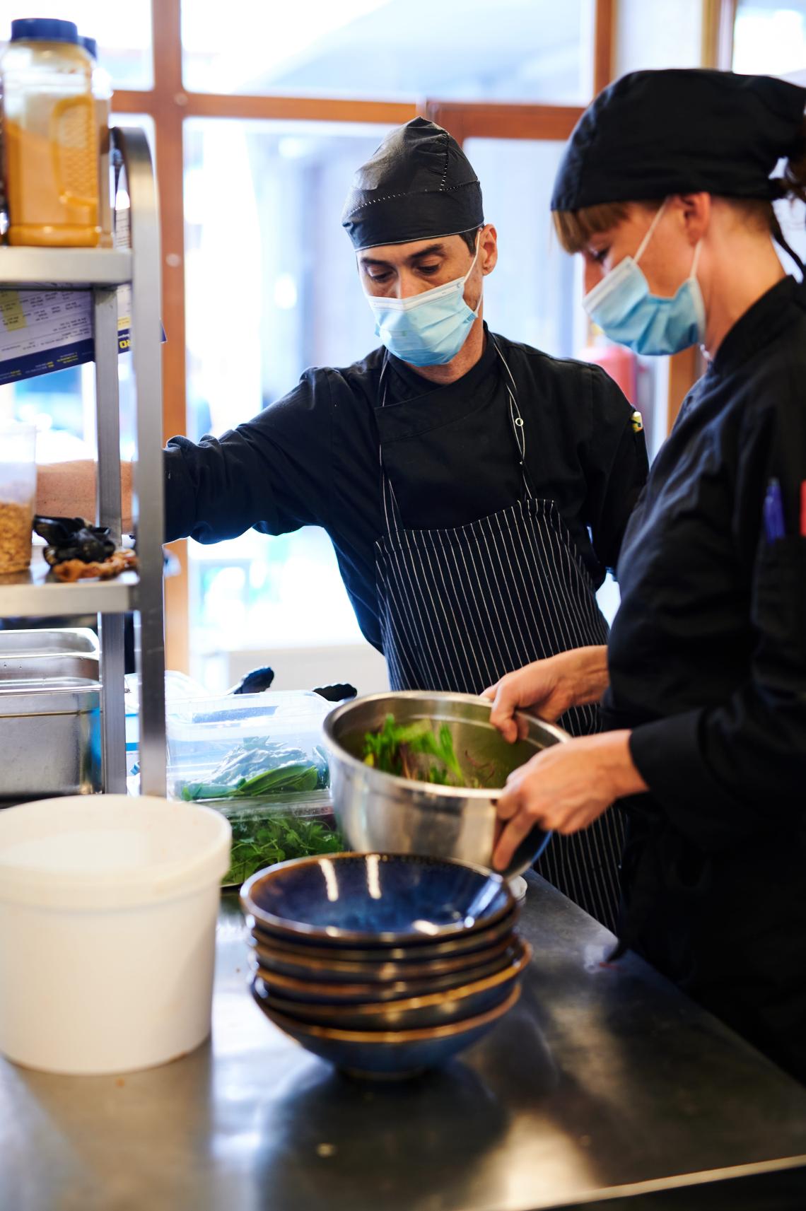 Les Ateliers du Midi biedt elke dag een selectie van dagschotels, broodjes en desserts aan, allemaal op basis van lokale en seizoensproducten en met vegetarische opties.
