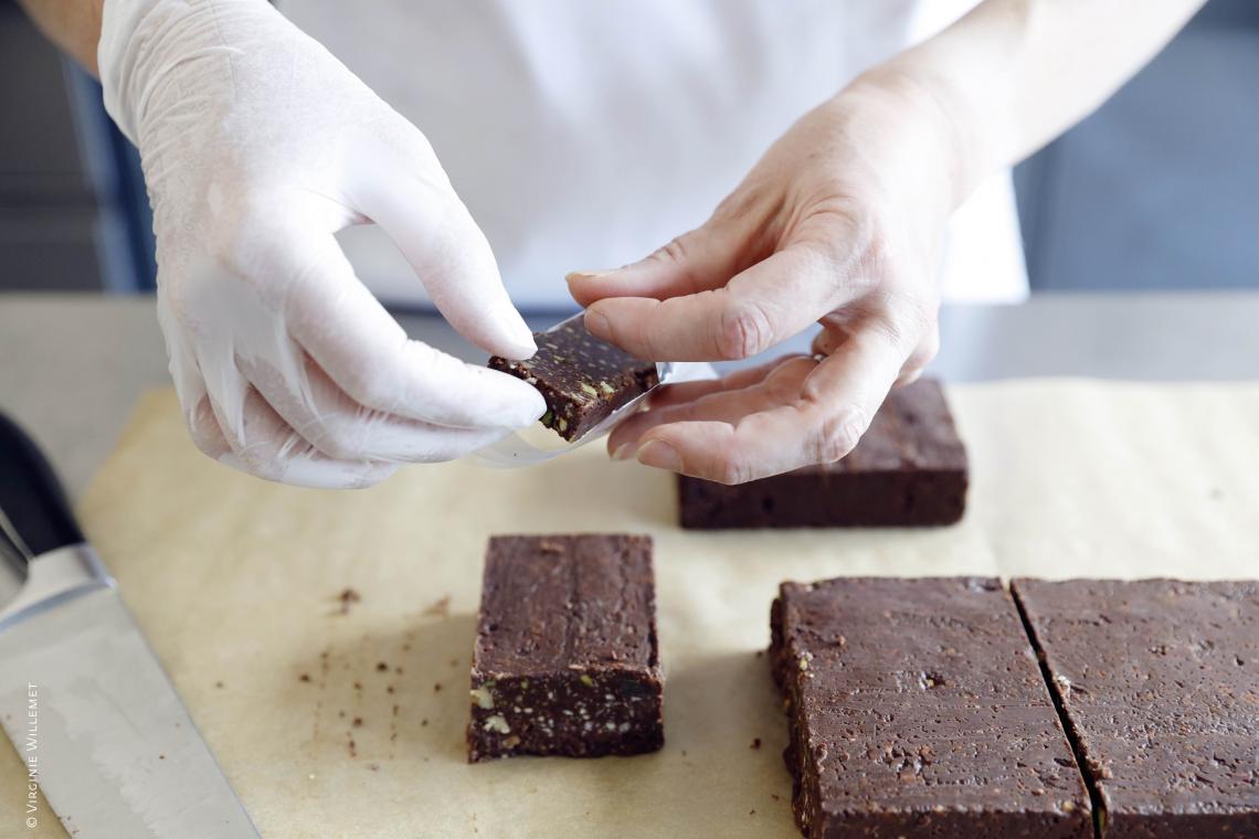 We stellen verschillende smaken voor: geconfijte sinaasappel of roze peper van Madagaskar gemengd met chocolade (min. 70 % cacao), een mengsel hennep-cacao of een subtiele combinatie van karwijzaden met zout. We maken deze rauwe delicatessen met dadelpasta, noten, hazelnoten, pistaches, kokosnoot en rozijnen, die we op het laatste moment vermalen.