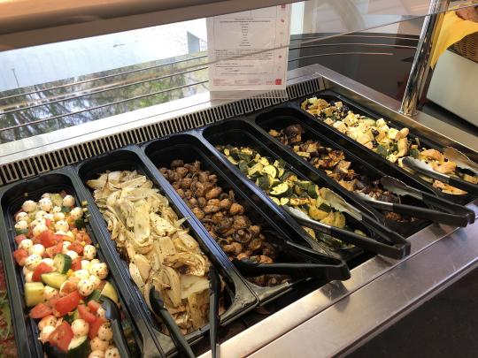 Nous offrons un salade bar végétarien, un salade bar protéine, ainsi qu'un plat du jour et un plat du monde. Tous les jours un plat végétarien est préparé chez nous.